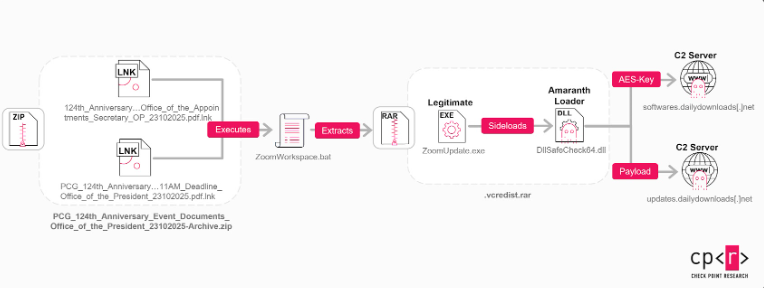 Em campanhas anteriores, registradas por volta de março de 2025, os ataques começaram com arquivos ZIP contendo atalhos (LNK) e scripts (BAT). Esses arquivos executavam o Amaranth Loader por meio de DLL side-loading.