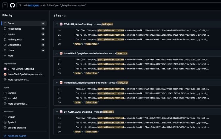 Os pesquisadores também encontraram projetos que executavam malware por meio de tarefas do VS Code. Em alguns casos, o código remoto era enviado diretamente para um shell ou decodificado a partir de dados binários escondidos em arquivos falsos de fonte.