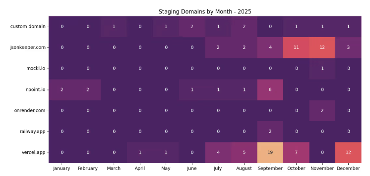 Quase 90% das contas foram criadas com endereços de e-mail do Gmail. Além disso, em mais de 80% dos incidentes, os criminosos utilizaram pelo menos seis serviços legítimos para hospedar cargas maliciosas. Entre eles estão JSON Keeper, Mocki, Point.io, Render, Railway e Vercel. Ao longo de 2025, a Vercel foi o serviço mais utilizado.