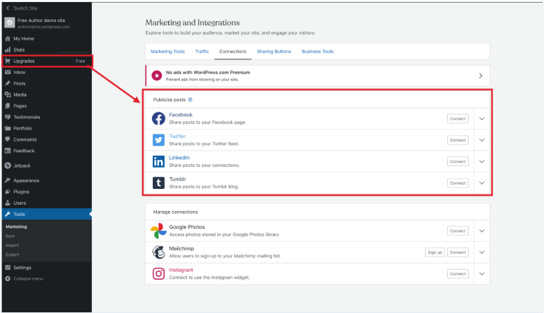 O WordPress.com oferece diversas ferramentas integradas para transformar seu site em um hub central de comunicação com suas redes sociais.