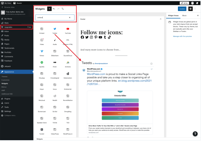 Outra forma de integrar redes sociais ao WordPress.com é exibindo conteúdos diretamente no seu site.