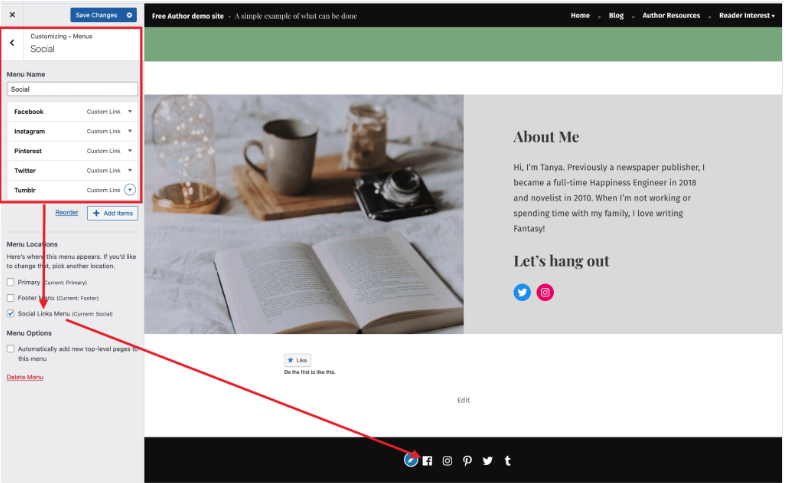 Muitos temas do WordPress.com possuem um Menu Social dedicado, que permite conectar facilmente seus perfis sociais ao site.