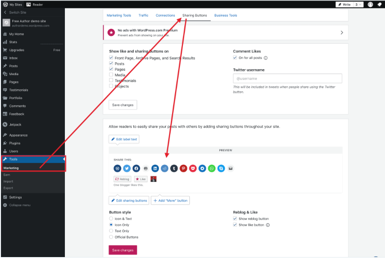 O WordPress.com oferece o recurso de Compartilhamento Social, que adiciona botões de compartilhamento diretamente em seus conteúdos.