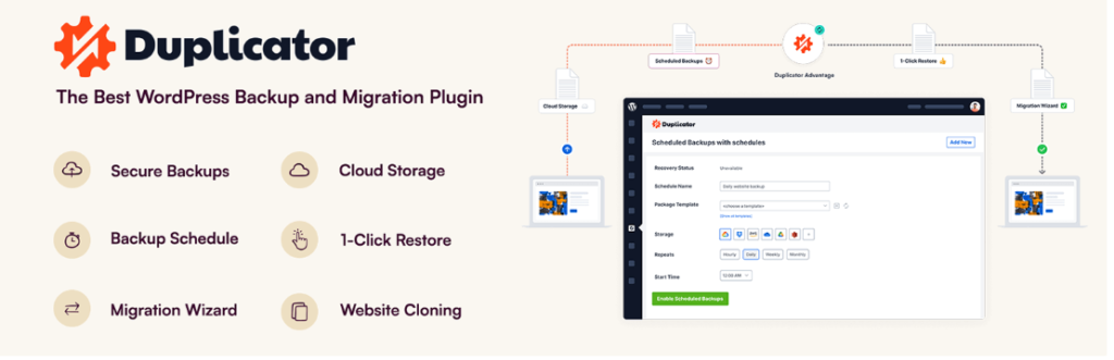 Ele faz backup completo do seu site, incluindo arquivos, banco de dados e plugins, e oferece opções de agendamento para que você possa automatizar o processo de backup.