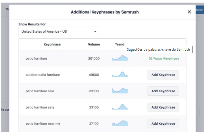 O AIOSEO mostrará uma lista de palavras-chave relacionadas, juntamente com o volume de buscas e as tendências .