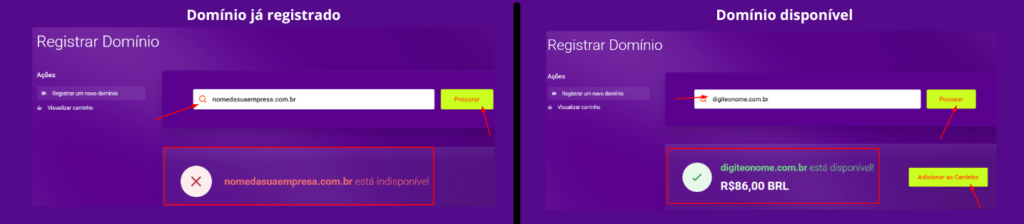 Após verificar que o domínio está disponível, clique em registrar domínio ou adicionar ao carrinho.