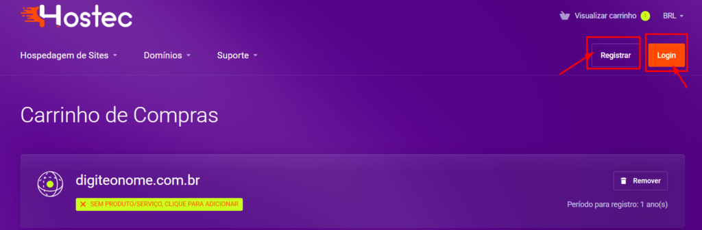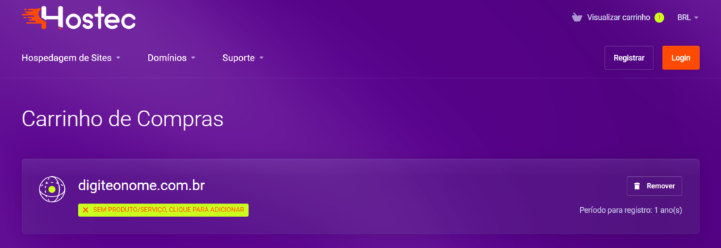 Passo 4 – adicionar o domínio ao carrinho na Hostec