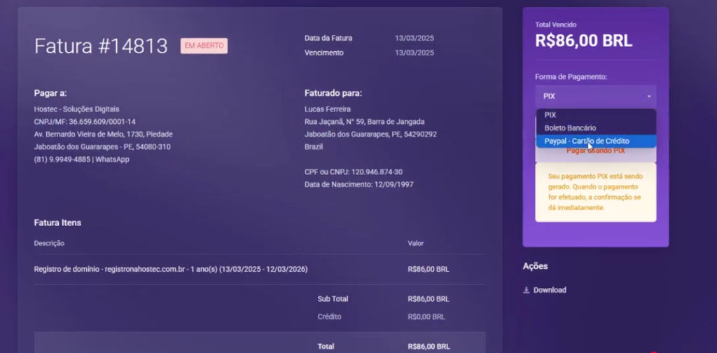 Tela de pagamento e finalização do pedido de domínio na Hostec