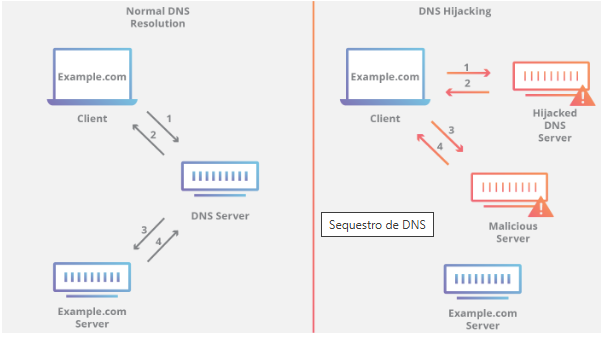 No sequestro de DNS, o invasor redireciona consultas para um nameserver diferente do legítimo. Isso pode ocorrer por meio de malware ou alteração não autorizada nas configurações do servidor.