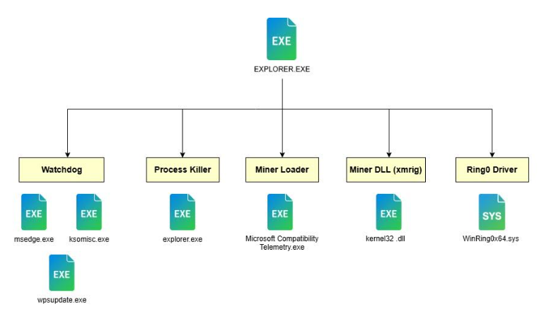 A investigação revelou uma cadeia de infecção em múltiplas etapas. O malware prioriza maximizar a taxa de mineração e, por causa disso, frequentemente provoca instabilidade no sistema afetado.